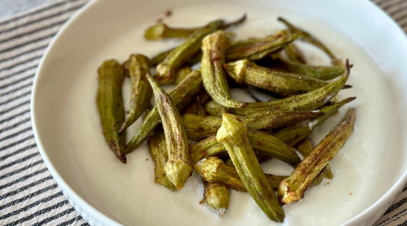 За финален допир, сервирајте ја пржената бамја со малку јогурт како освежување и уживајте во аромата и текстурата.