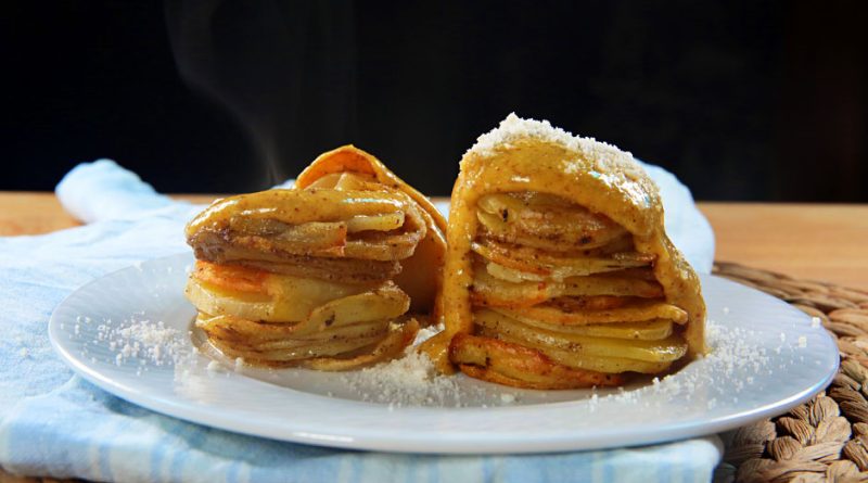 За јагузите, подгответе ги како што следи: исечете ги на тенки ленти, растопете путер и соединете го со јагузите. Со додавање на сол, црн пипер и захтин во прав, оставете ги да се интегрираат заедно. Подгответе калапите со мала маст, распоредувајќи ги парчињата во ред.