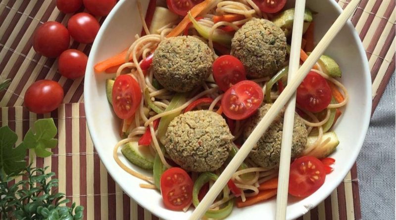 Рецепт за спагети со фалафел и зеленчук: вкусна и здрава опција со печени лебени топчиња од леќа и целосна пченица.